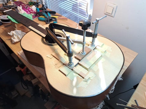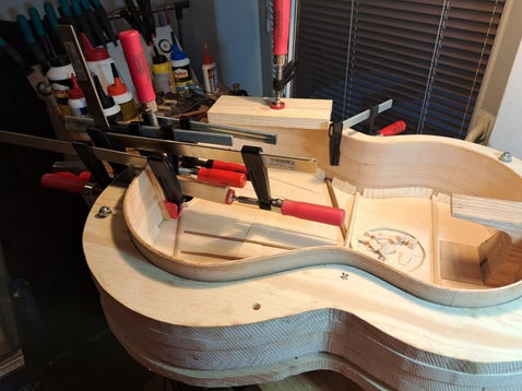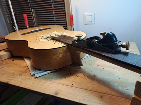 The process of making guitar #5 - Maestra is shown. The soundboard is made of Alpine spruce, the fan bracings are a combination of spruce and cedar, the harmonic bars are spruce, reinforcements are spruce and maple.The guitar's side body is a double layer of elm and pine, the bottom plate is made of elm. The neck is of oak, decorated with walnut and spruce, the heel of the neck is of elm wood. The fretboard and bridge are of smoked black oak. The bindings and purflings are black oak and maple. French polish. Above all, the guitar sounds beautifully..