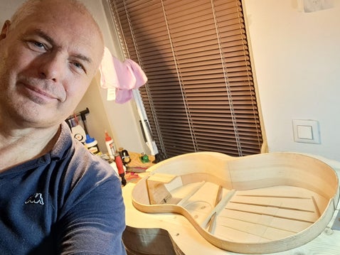 First Lole test: Strong projection and dark bass. She is very responsive and needs little energy to play. The length of the scale is 650 mm and the nut width is 53 mm. The soundboard is made of spruce, the sides are a sandwich of elm and pine (inside), the bottom plate is made of elm. The supports under the soundboard are made of spruce and cedar. The transverse supports on the bottom plate are made of cedar. The neck is made of oak. French polish. The guitar sings top-notch.