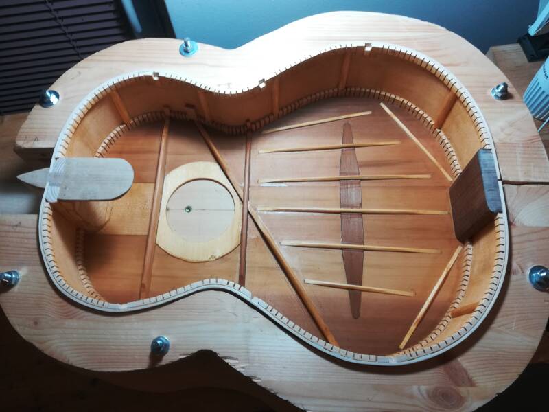 Zlepljena zvočna plošča na stranice. Rebrenje po načrtih Ramireza iz leta 1966. Zvočnica iz cedre, pahljačasta rebra iz smreke (posvetli visoke tone), harmonska rebra iz cedre.