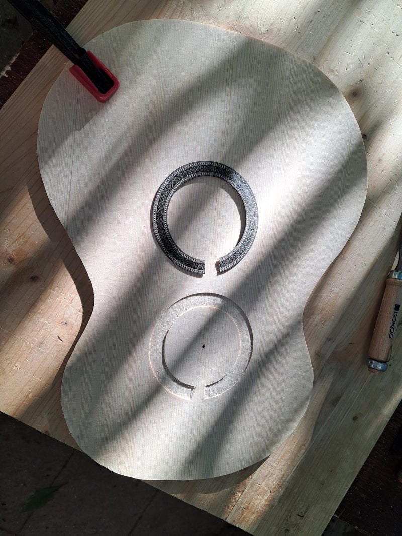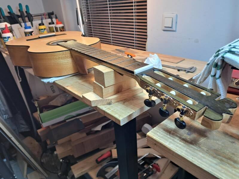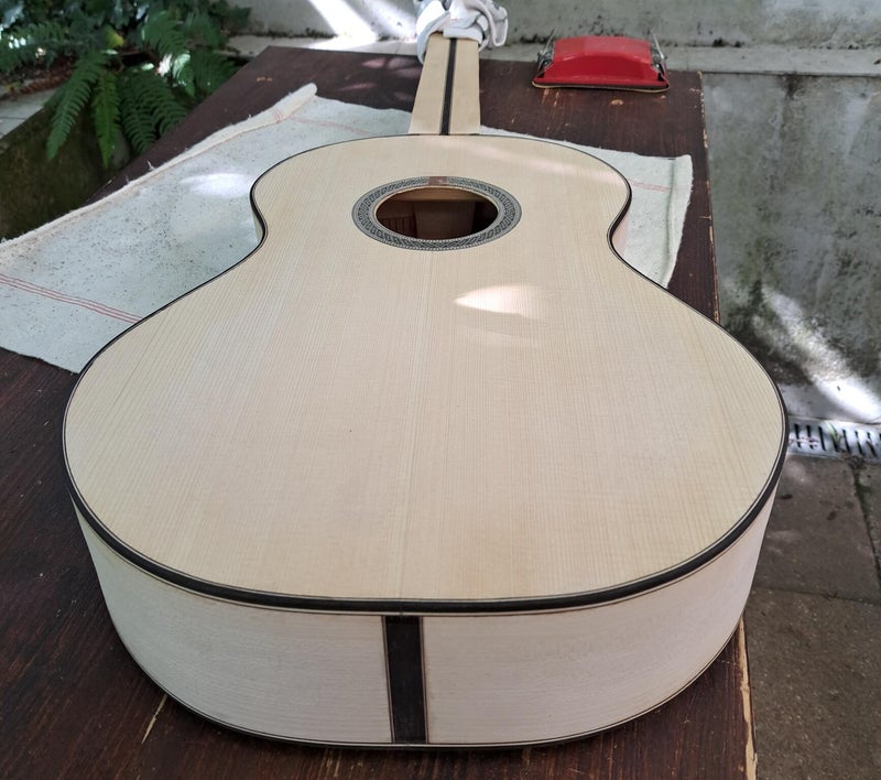 First Lole test: Strong projection and dark bass. She is very responsive and needs little energy to play. The length of the scale is 650 mm and the nut width is 53 mm. The soundboard is made of spruce, the sides are a sandwich of elm and pine (inside), the bottom plate is made of elm. The supports under the soundboard are made of spruce and cedar. The transverse supports on the bottom plate are made of cedar. The neck is made of oak. French polish. The guitar sings top-notch.