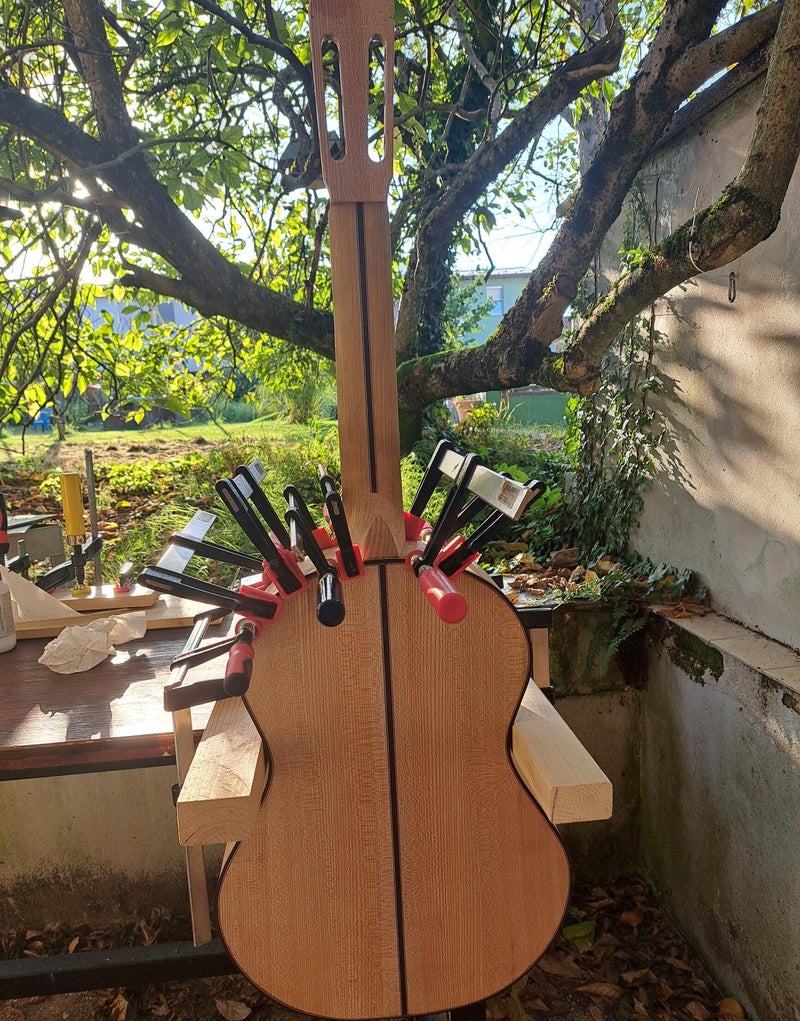 The process of making guitar #5 - Maestra is shown. The soundboard is made of Alpine spruce, the fan bracings are a combination of spruce and cedar, the harmonic bars are spruce, reinforcements are spruce and maple.The guitar's side body is a double layer of elm and pine, the bottom plate is made of elm. The neck is of oak, decorated with walnut and spruce, the heel of the neck is of elm wood. The fretboard and bridge are of smoked black oak. The bindings and purflings are black oak and maple. French polish. Above all, the guitar sounds beautifully..