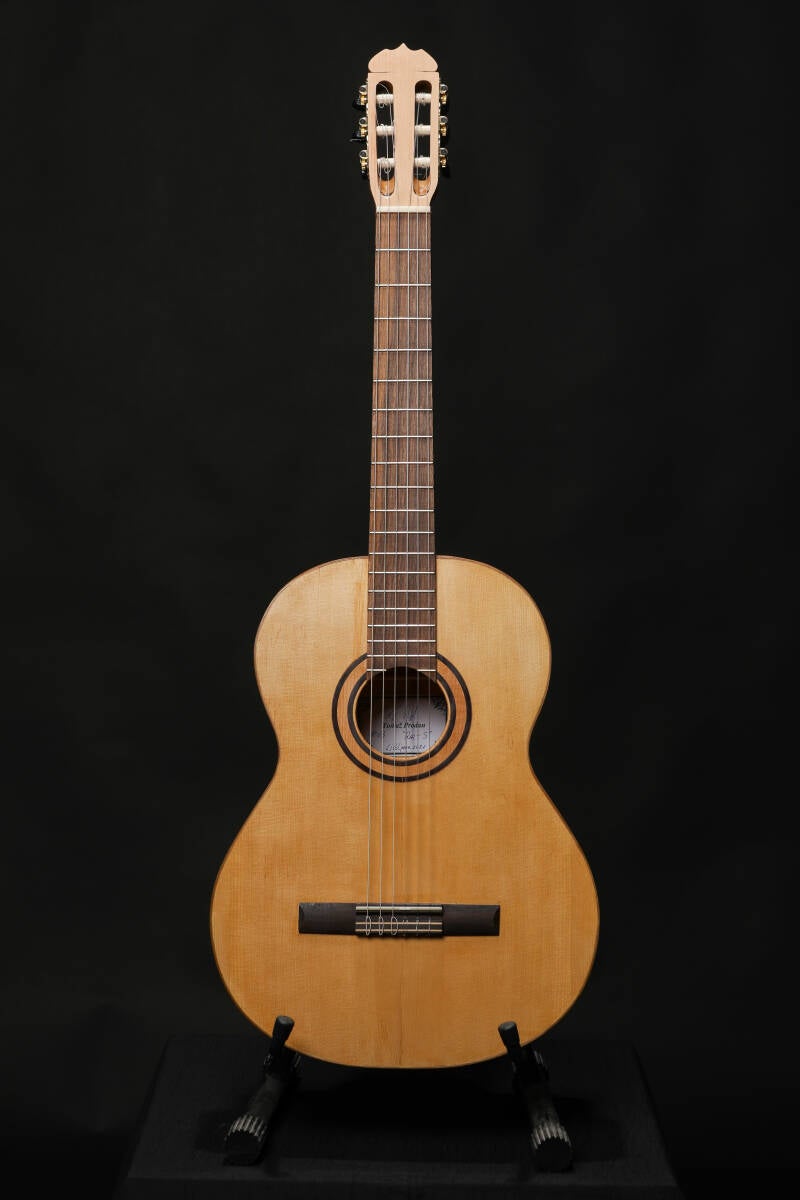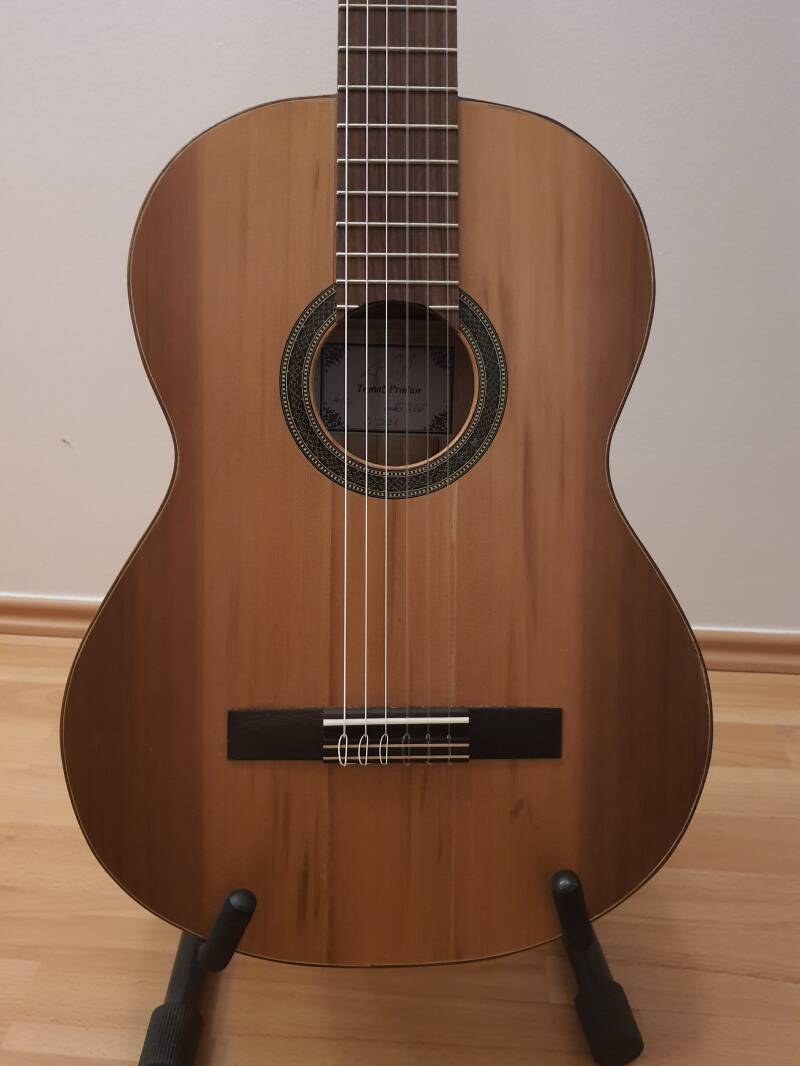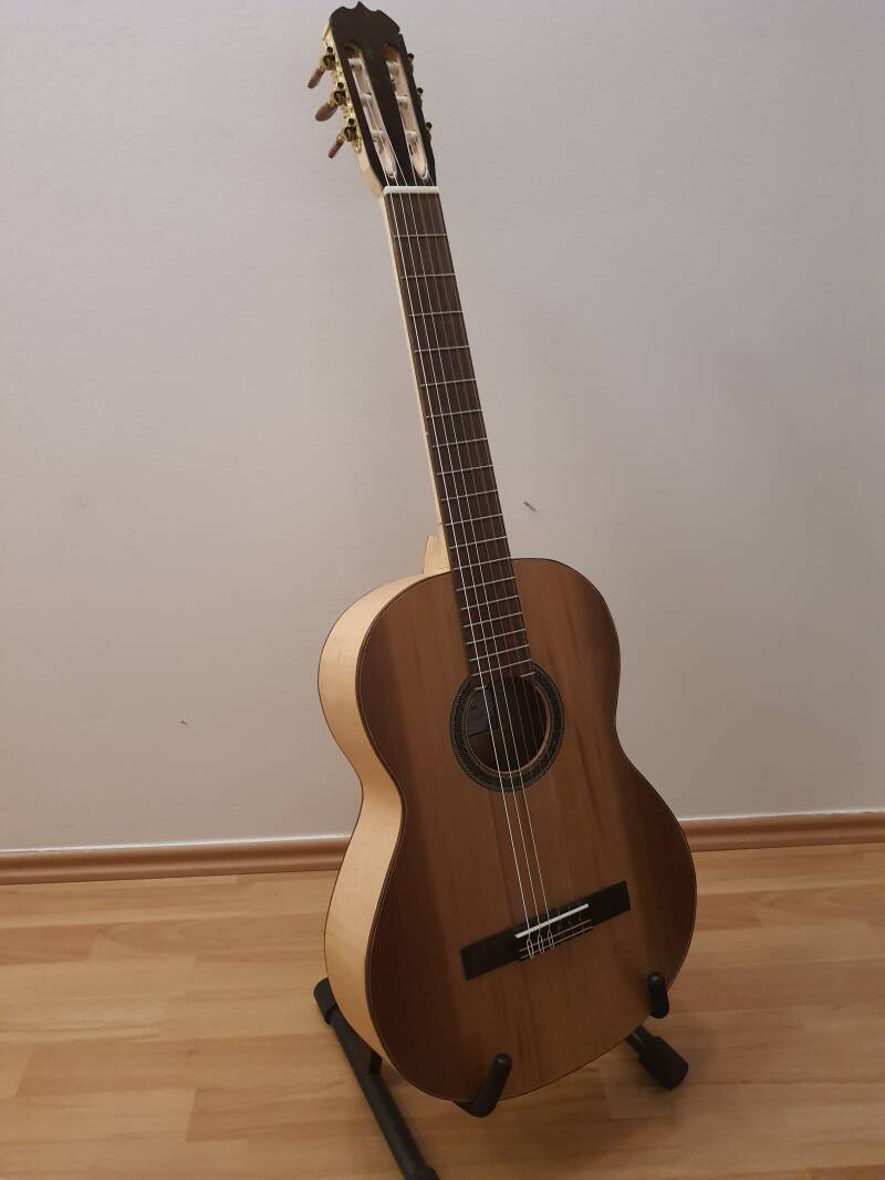 Sound board/Zvočnica - Cedar/Cedra, back and sides/telo - maple/Javor, neck/vrat - maple/Javor, fingerboard/ubiralka - walnut/Oreh, bindings/robovi - walnut + spruce/Oreh+JSmreka, French polish/Šelak - Francoska politura. Scale lenght/menzura 660 mm and nut/vrat 53 mm. Ramirez 1A, 1966 model.